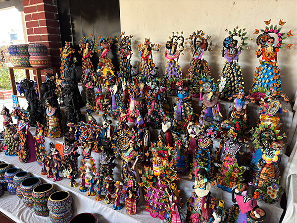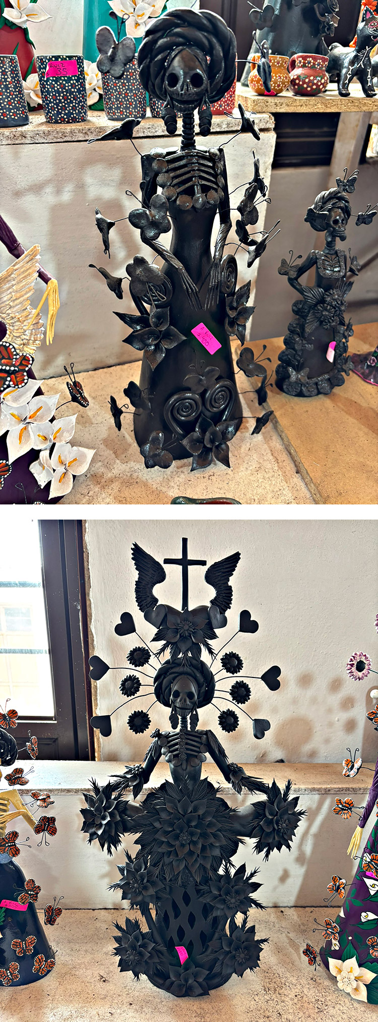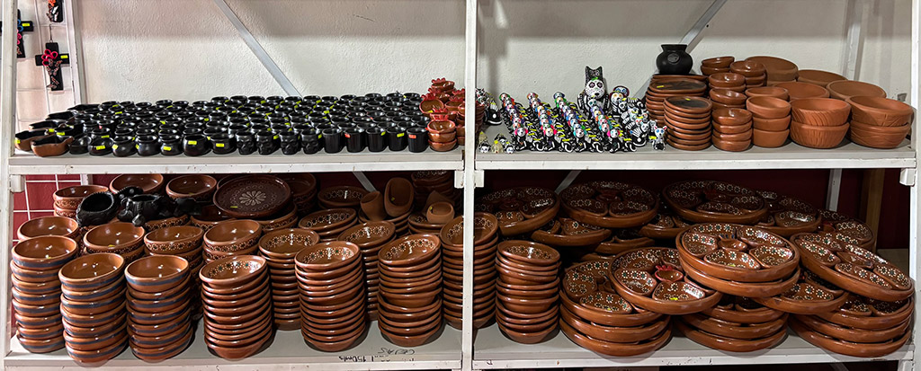 Karina, my most excellent tour guide and hostess, took me to the little town of Capula first. The dusty streets were dotted with little shops showing off their mugs, cups, plates, serving dishes, comals, pots, and figurines. The figurines have definitely taken over their trade. With colorful Catrinas, that have become synonymous with Día de Muertos taking center stage. Every storefront had the Catrina figures and skulls of different varieties on their shelves. Most were brightly colored, some were unpainted brown clay, but some of my favorites were pure black clay with incredible attention to detail.