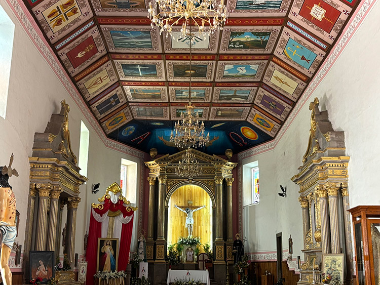 After eating all that pork, I needed to go for a walk. Which with any good Mexican town leads you straight to church. The ceiling was covered in the painted and lacquered wood that the town is supposed to be known for. The designs were beautiful and there was a rich depth of color to them. Each panel had an individual theme, some were symbols of Christianity, others were biblical scenes. Above the altar was a scene of Jesus, arms outstretched