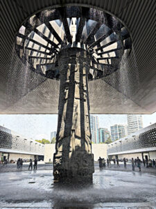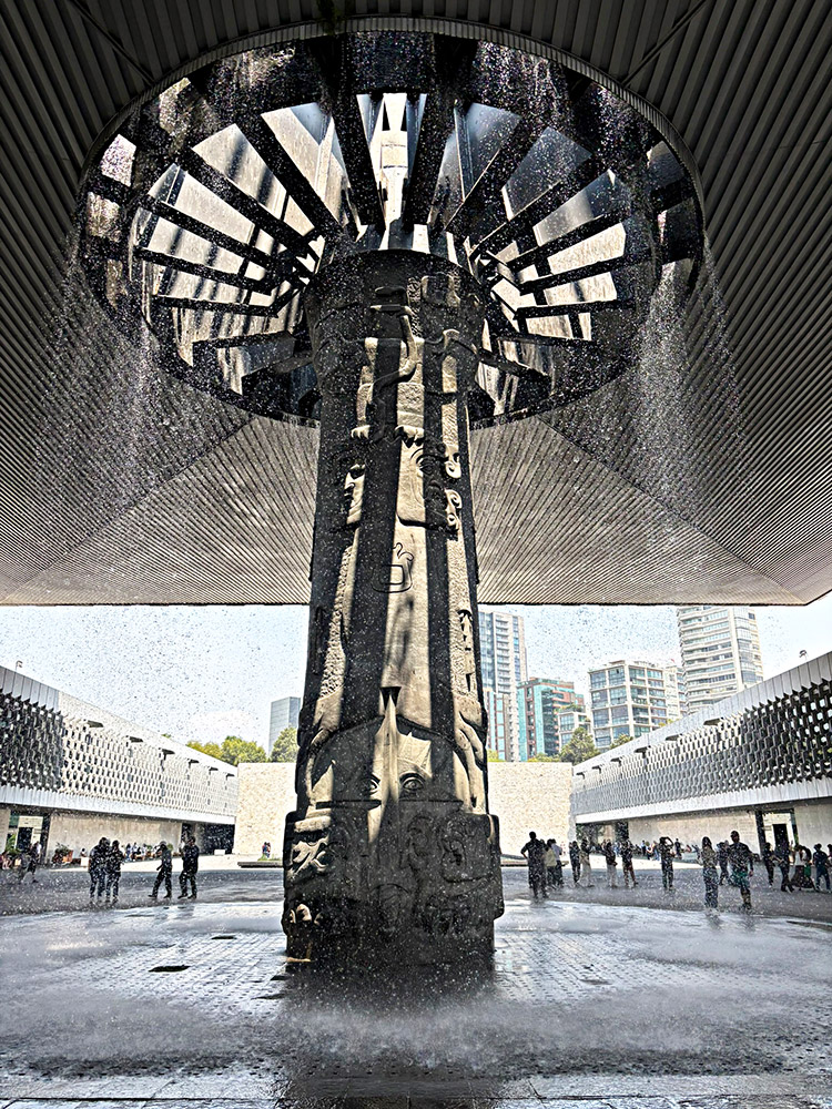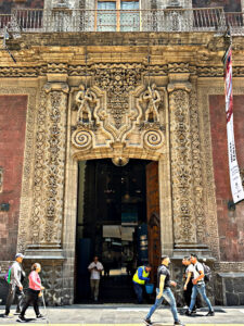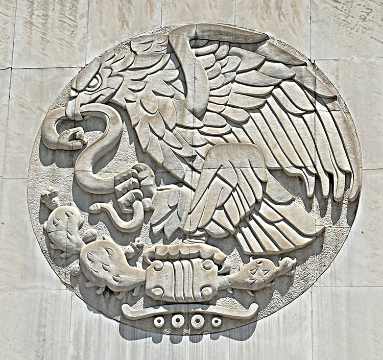 Over the entrance is a massive carving of the Mexican eagle standing on a cactus with a snake in it’s beak. This leads into a massive “vestibule” that leads to an even more massive courtyard with a fifty-five foot high fountain known as El Paraguas, or umbrella, due to it’s unique design. (below to the left)