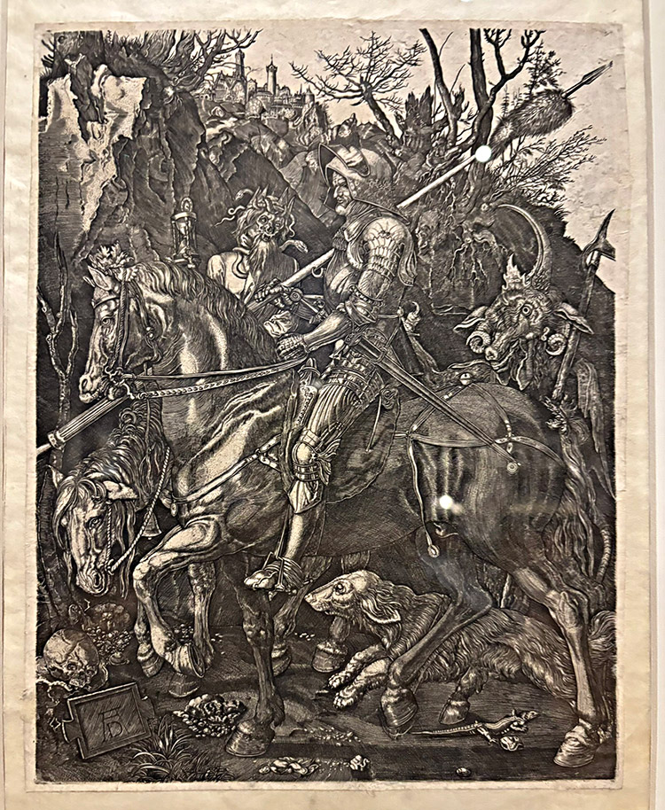 This etching on paper by Alberto Duero is titled The Knight, Death, and The Demon. It is a surrealistic onslaught of detail and precision.