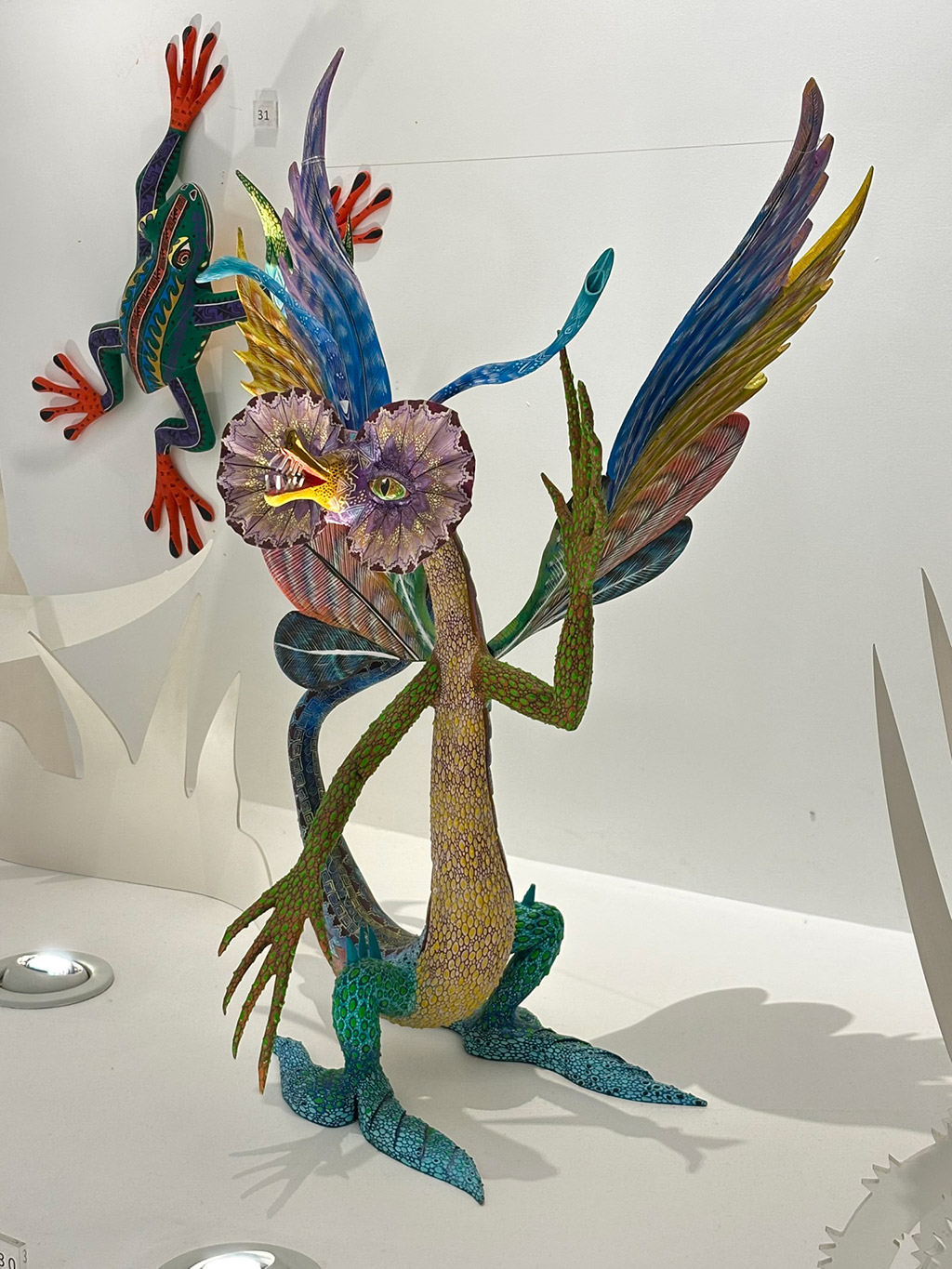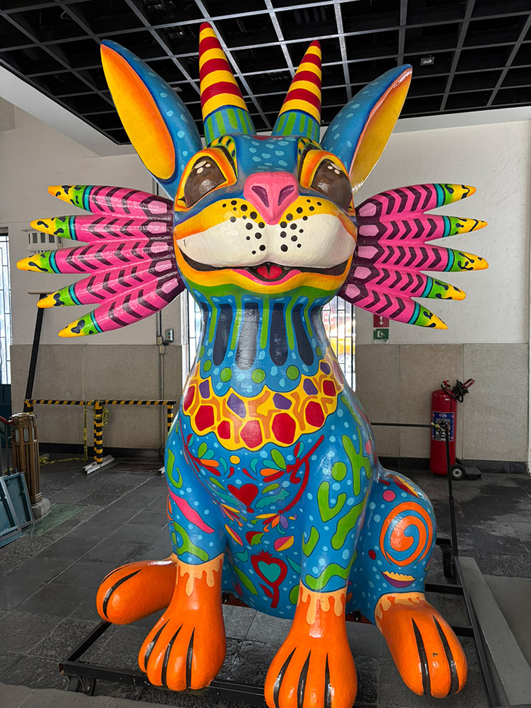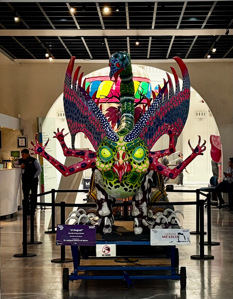 The Museo de Arte Popular greets you at the front door with this wickedly bright and terrifying Alebrije. Alebrije doesn’t have an exact definition but think along the lines of spirit animal. They are a very popular and colorful art form around Mexico. They stem from the Zapotec and Mixtec cultures where they were believed to be protectors and spirit guides. However the modern interpretation of them came in the 1930’s from Pedro Linares, a papier‑mâché artist, who began creating the surreal creatures after experiencing vivid hallucinations during an illness. Mexicans embraced them much the way they did the Catrinas that Diego Rivera popularized in the 40’s.