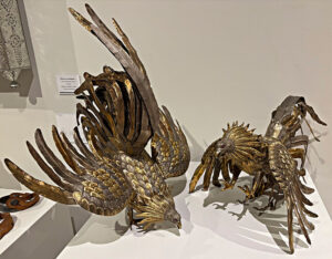 He’s meant to represent strength, courage, and virility. There are hats and shirts emblazoned with the rooster. And here are two roosters in bronze getting ready for a fight.